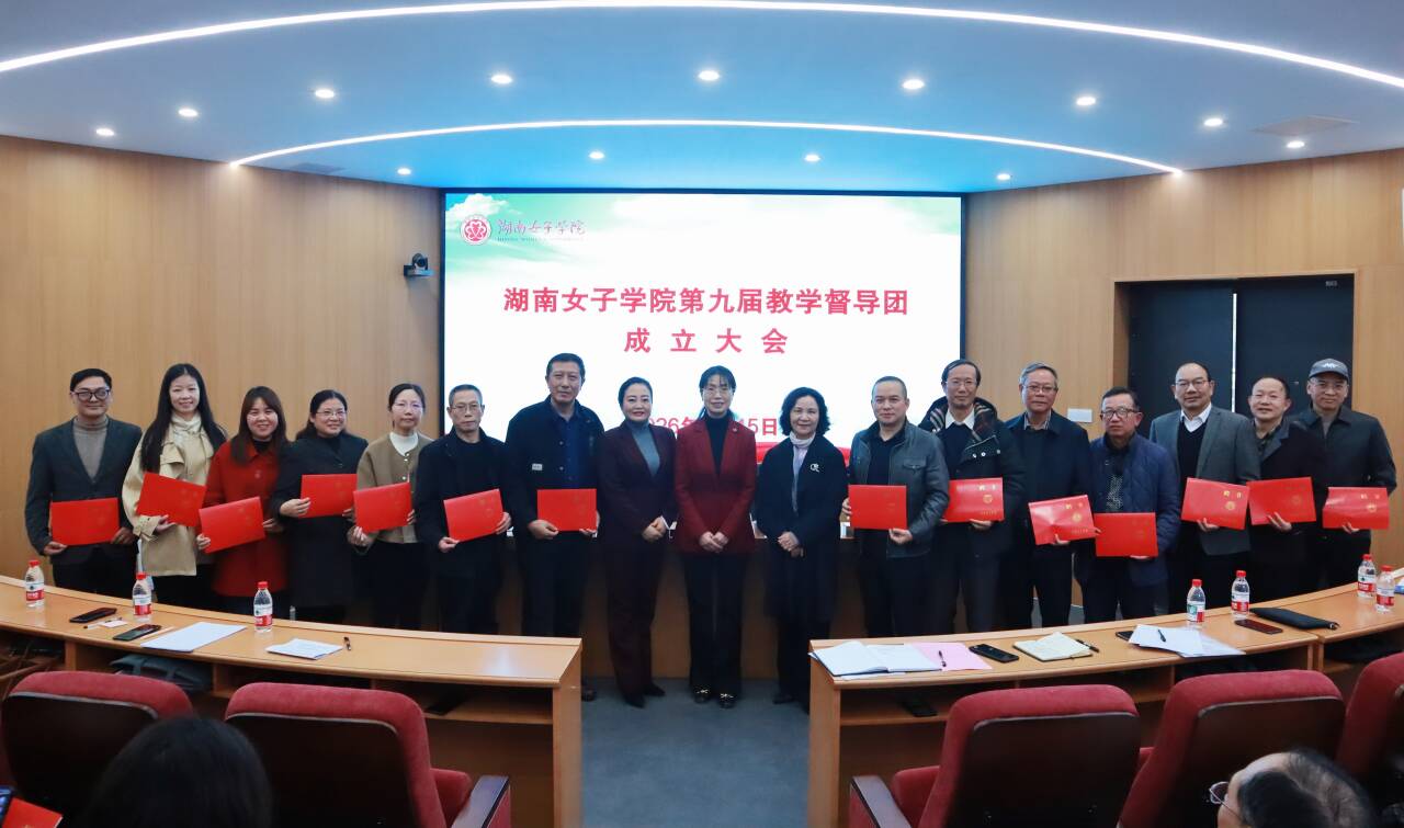 首先,副校长石潇纯宣读《关于成立湖南女子学院第九届教学督导团的通知》,明确第九届教学督导团任期为2026年1月1日至2028年8 月31日,公布了新一届教学督导团成员名单。随后,校领导为第九届校级教学督导员颁发了聘书。